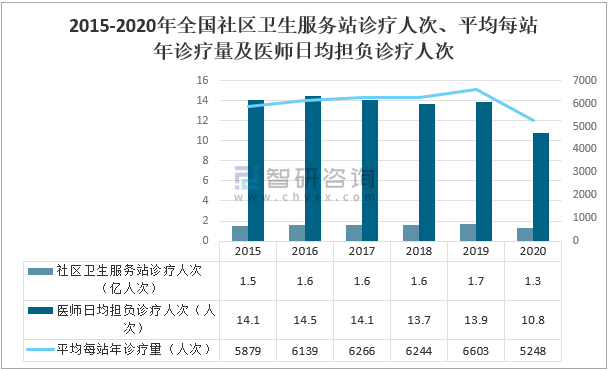 2020年,全國社區(qū)衛(wèi)生服務(wù)站診療人次1.3億人次,比上年減少0.4億人次;醫(yī)師日均擔(dān)負(fù)診療10.8人次,比上年減少3.1人次;平均每站年診療量5248人次,比上年減少1355人次。