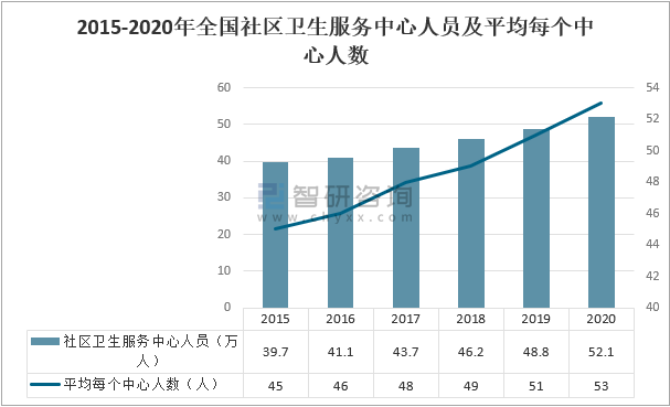 2015-2020年全國社區(qū)衛(wèi)生服務(wù)中心人員及平均每個(gè)中心人數(shù)