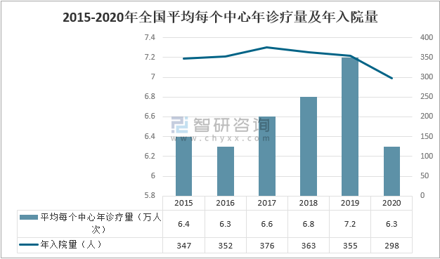 2015-2020年全國平均每個(gè)中心年診療量及年入院量