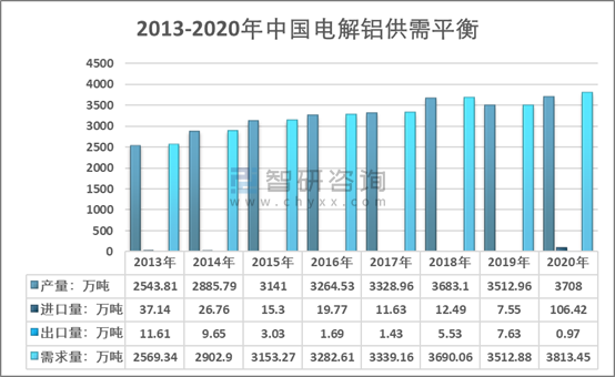 近幾年來我國電解鋁產量總體保持穩定增長,除2019年有小幅回落,其他年份均維持增行的態勢。電解鋁需求方面,受海外市場需求不景氣,全球原鋁價格大幅下降,國內電解鋁出口大幅下降,進口爆發式增長,2020年國內市場需求顯著回升,全年消費量達到了3813.45萬噸。