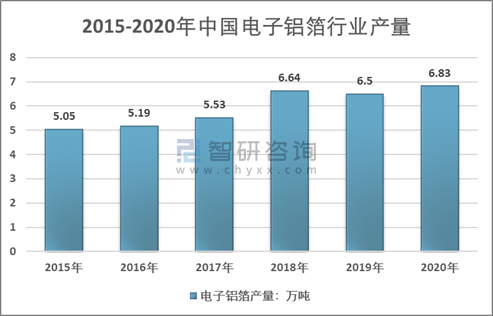 智研咨詢發布的《2022-2028年中國電子鋁箔行業市場專項調研及發展策略分析報告 》顯示:2020年我國電子鋁箔行業產量約6.83萬噸,同比2019年的6.5萬噸增長了5.08%,近幾年我國電子鋁箔行業產量情況如下圖所示: