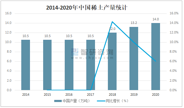 稀土被稱之為“現代工業的維生素”,作為國家戰略性資源,它不僅在石油、化工、冶金、紡織、陶瓷、玻璃、永磁材料等領域得以重用,而且在國防軍工和高新技術產業也起著關鍵性作用。近年來隨著稀土開采開發技術以及新能源領域的不斷發展,中國稀土產量呈現出較快的增長勁頭,2020年中國稀土產量達14萬噸,較2019年增加了0.8萬噸,同比增長6.1%。