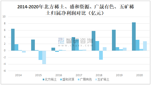 2014-2020年北方稀土、盛和資源、廣晟有色、五礦稀土歸屬凈利潤對比(億元)