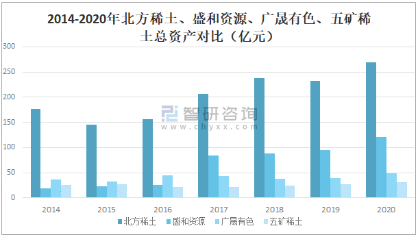 2014-2020年北方稀土、盛和資源、廣晟有色、五礦稀土總資產對比(億元)