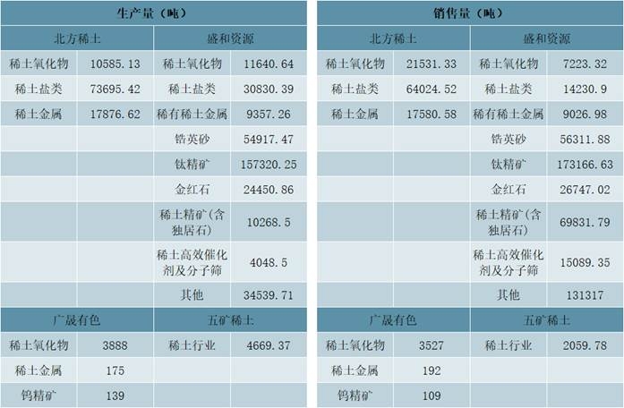 2020年北方稀土、盛和資源、廣晟有色、五礦稀土主要產品產銷量對比(噸)