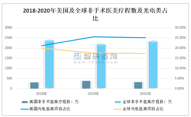 2019年,全球非手術醫美療程數2222萬,全球光電醫美項目占比17.55%;美國非手術醫美療程數402萬,美國光電醫美項目占比25.51%。2020年,全球非手術醫美療程數2359萬,全球光電醫美項目占比17.32%;美國非手術醫美療程數333萬,美國光電醫美項目占比25.06%。從數據可以看出美國光電醫美項目占比要高于全球光電醫美項目占比。