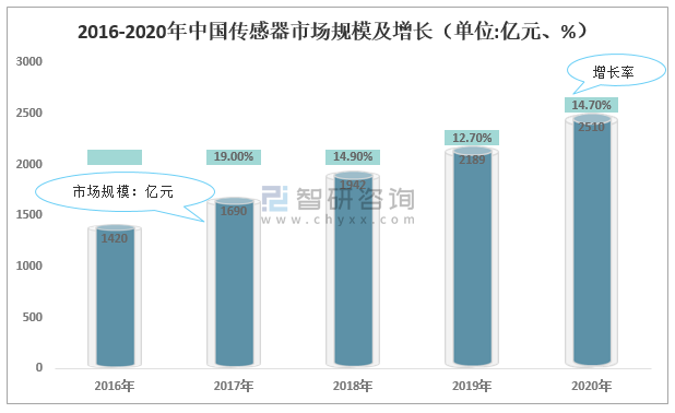 放在全球范圍來看,其實我國的傳感器總體起步比較晚,我國與國外的技術差距較大,但是目前國內的傳感器技術發展水平正在飛速發展階段,未來發展勢頭大好。2016-2020年期間,中國傳感器市場規模逐年增長,截止2020年底,中國中國傳感器市場規模2510億元,同比增長14.7%,較2016年增長1090億元。