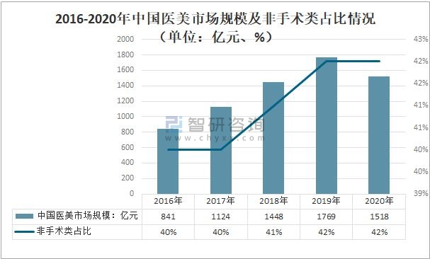伴隨著顏值經濟的崛起,中國醫美市場規模持續快速發展,其中非手術類輕醫美市場表現突出,成為醫美市場的新增長點。2016-2019年期間,中國醫美市場規模逐年增長,2019年中國醫美市場規模達到1769億元,較2016年增長:億元,非手術類占比42%;2020年在疫情的影響下,中國醫美市場規模降至1518億元,非手術類占比42%,與2019年持平。隨著國民對于醫療美容手術風險及效果認知的提升,預計未來非手術類醫美占比很有可能呈現上升趨勢