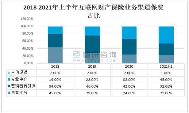2021年上半年,互聯網財產保險業務各渠道保費占比呈差異化發展,其中,專業中介渠道累計保費收入為214億元,占比為45%,較2020年底提升13個百分點;保險公司自營平臺累計保費收入為104億元,占比為22%,較2020年底下滑2個百分點;營銷宣傳引流累計保費收入為150億元,占比為32%,較2020年底下滑10個百分點。