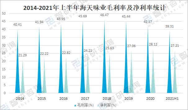 2014-2021年上半年海天味業毛利率及凈利率統計(%)