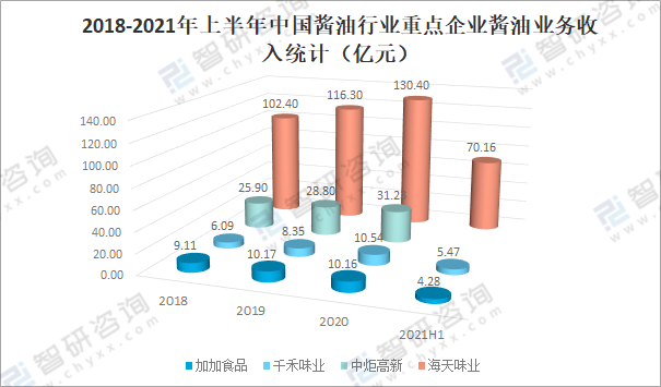 經過多年的發展,一大批優秀的醬油生產企業迅速崛起,逐漸成為醬油行業中的翹楚,如千禾味業、中炬高新、海天味業、加加食品等。從2018-2021年上半年中國醬油行業重點企業醬油業務收入對比數據可以看出,海天味業醬油業務收入明顯高于千禾味業、中炬高新和加加食品,目前中國醬油市場格局仍然較為分散,但海天味業龍頭優勢明顯。