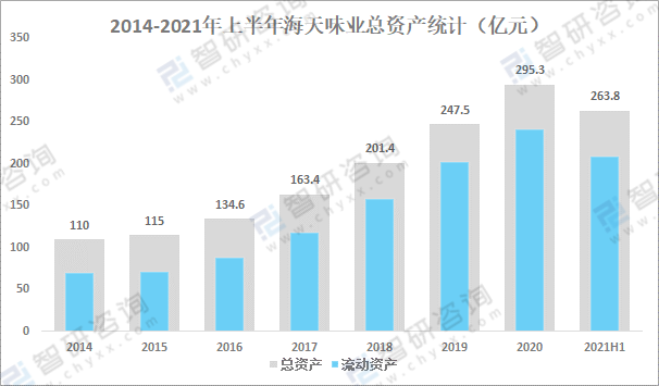從總資產來看,海天味業總資產逐年增長,2020年海天味業總資產達295.3億元,較2019年增加了47.80億元,同比增長19.3%,2021年上半年海天味業總資產已達263.8 億元,其中流動資產為208.6億元。