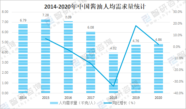 智研咨詢發布的《2022-2028年中國醬油行業發展動態及投資前景分析報告》數據顯示:醬油具有豐富的營養價值,含有多種呈味物質,口感鮮美,深受人們喜愛,2020年中國醬油人均需求量達4.86千克/人,較2019年增加了0.10千克/人,同比增長2.1%。