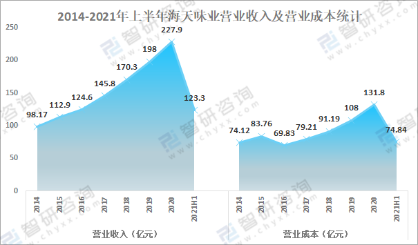 2014-2021年上半年海天味業營業收入及營業成本統計(億元)
