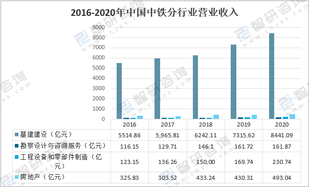 2016-2020年中國中鐵分行業營業收入