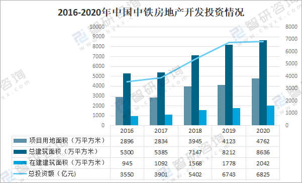 中國中鐵房地產開發投資情況來看,2020年,中國中鐵房地產開發業務總投資額6825億元,較上年增加82億元;項目用地面積4762萬平方米,較上年增加639萬平方米;總建筑面積8636萬平方米,較上年增加424萬平方米;在建建筑面積2042萬平方米,較上年增加264萬平方米。
