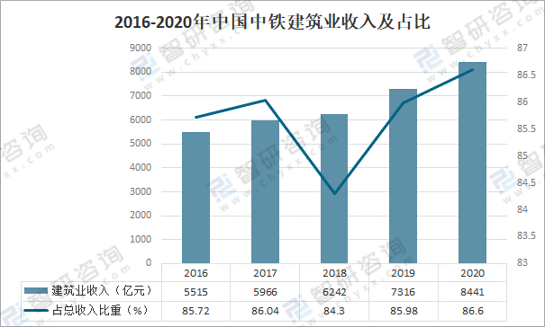 中國中鐵建筑業收入中,2020年,中國中鐵建筑業收入8441億元,較上年增加1125億元,同比增長15.38%,占總收入比重的86.6%,較上年提升0.62個百分點。