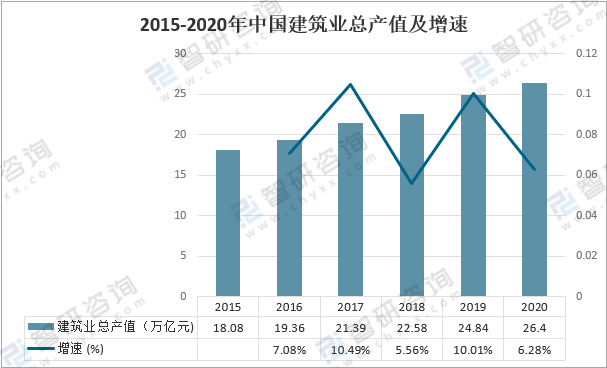 我國建筑業攻堅克難,率先復工復產,為快速有效防控疫情提供了強大的基礎設施保障,為全國人民打贏疫情防控阻擊戰做出了重大貢獻,保證了發展質量和效益的不斷提高。2020年,中國建筑業總產值26.4萬億元,較上年增加1.56萬億元,同比增長6.28%。