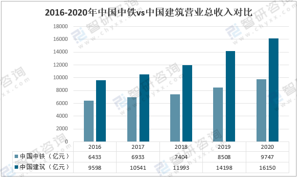 從營業總收入來看,2020年,中國中鐵多項業績指標連續創歷史最好水平,營業總收入9747億元,較上年增加1239億元,同比增長14.56%;中國建筑經營情況持續健康平穩發展,完成營業收入16150億元,較上年增加1952億元,同比增長13.7%。