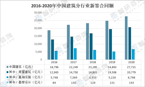 2016-2020年中國建筑分行業新簽合同額