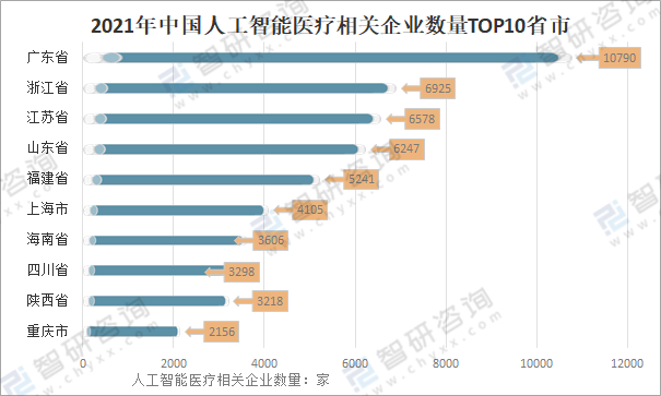從人工智能醫療相關企業數量省市分布來看,廣東省有人工智能醫療相關企業數量10790家,遙遙領先其它省市;浙江有人工智能醫療相關企業數量6925家,位于全國第二;第三是江蘇省,有人工智能醫療相關企業數量6578家。