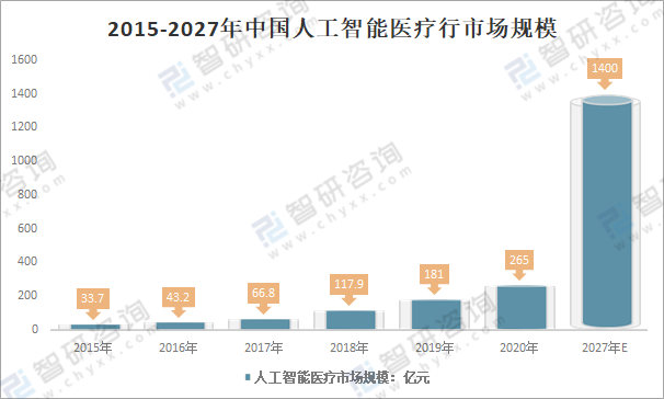 據相關數據顯示,2020年,我國醫療人工智能行市場規模已達到265億元,同比增加了46.4%,預計2027年,我國醫療人工智能行業市場規模將達到1400億元,市場發展潛力巨大。