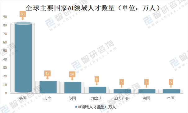 全球主要國家AI領域人才數量(單位:萬人)