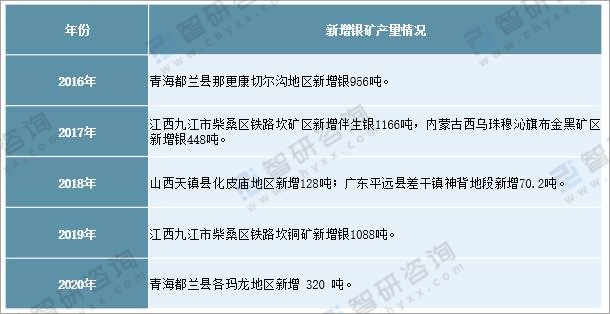 2016年中國新發(fā)現(xiàn)銀礦產(chǎn)地2處,其中:大型1處,中型1處;2017年中國新發(fā)現(xiàn)銀礦產(chǎn)地4處,其中:大型1處,中型2處,小型1處;2018年中國新發(fā)現(xiàn)小型銀礦產(chǎn)地1處;2019年中國新發(fā)現(xiàn)中型銀礦產(chǎn)地2處;2020年沒有新發(fā)現(xiàn)銀礦產(chǎn)地。