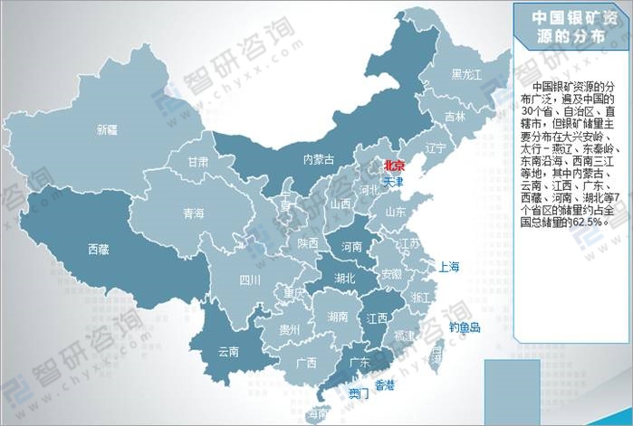 中國是世界上發(fā)現(xiàn)和開采利用銀礦最早的國家之一。中國銀礦資源的分布廣泛,遍及中國的30個省、自治區(qū)、直轄市,但銀礦儲量主要分布在大興安嶺、太行-燕遼、東秦嶺、東南沿海、西南三江等地,其中內(nèi)蒙古、云南、江西、廣東、西藏、河南、湖北等7個省區(qū)的儲量約占全國總儲量的62.5%。