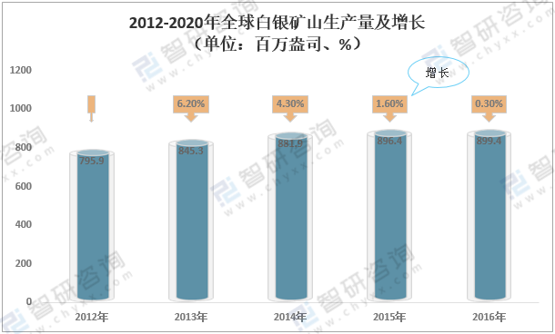 2012-2020年全球白銀礦山生產(chǎn)量及增長(單位:百萬盎司、%)