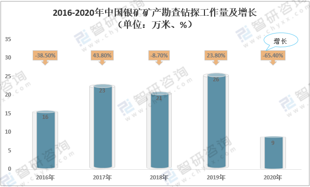 從我國銀礦礦產(chǎn)勘查鉆探工作量來看,2019年中國銀礦礦產(chǎn)勘查鉆探工作量26萬米,同比增長23.8%;2020年中國銀礦礦產(chǎn)勘查鉆探工作量9萬米,同比下降65.4%。