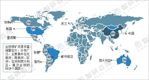 全球銀礦資源豐富,儲量巨大,分布廣泛,主要集中在北美洲、南美洲、歐洲、亞洲和澳大利亞,遍及全球的50多個國家。從全球銀礦資源的空間展布來看,儲量相對集中的國家有:秘魯、波蘭、智利、澳大利亞、中國、墨西哥、美國、玻利維亞和加拿大等,這9個國家的銀儲量之和約占全球總儲量的90%以上。