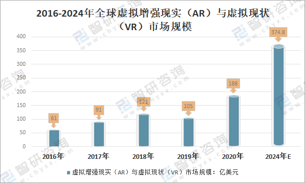 2016-2018年全球增強現(xiàn)實(AR)與虛擬現(xiàn)實(VR)市場規(guī)模逐年增長,2019年虛擬增強現(xiàn)實(AR)與虛擬現(xiàn)狀(VR)市場規(guī)模下降至105億美元,同比下降13.2%;2020年全球虛擬增強現(xiàn)實(AR)與虛擬現(xiàn)狀(VR)市場規(guī)模188億美元,同比增長79.0%;預計2024年全球虛擬增強現(xiàn)實(AR)與虛擬現(xiàn)狀(VR)市場規(guī)模可達到374.8億美元。