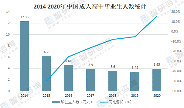 在中國成人高中在校生人數增加的同時,畢業生人數也在增加,2020年中國成人高中畢業生人數達3.95萬人,較2019年增加了0.53萬人,同比增長15.5%。