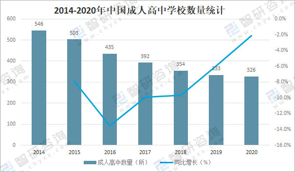成人高中是我國教育行業的重要組成部分,但近年來中國成人高中學校數量逐年減少,截止2020年中國共有326所成人高中學校,較2019年減少了7所,同比減少2.1%。