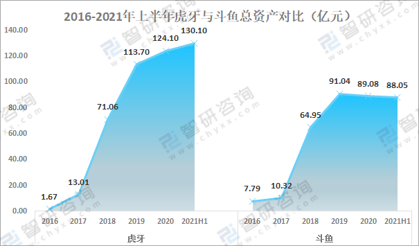 2016-2021年上半年虎牙與斗魚總資產(chǎn)對比(億元)