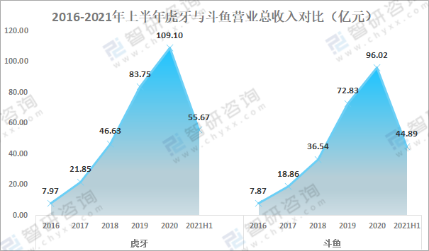 2016-2021年上半年虎牙與斗魚營業(yè)總收入對比(億元)
