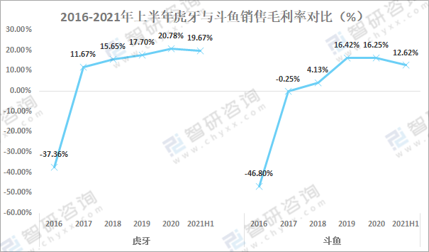 2016-2021年上半年虎牙與斗魚銷售毛利率對比(%)