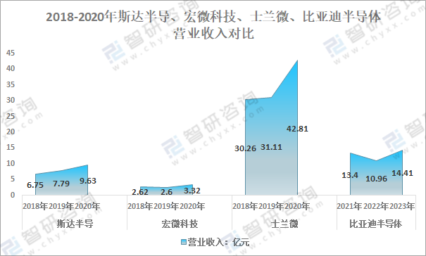 2018-2020年斯達半導、宏微科技、士蘭微、比亞迪半導體營業收入對比