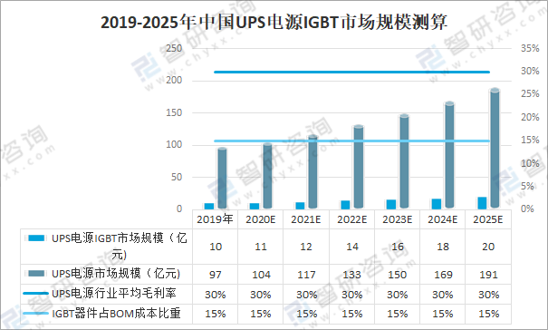 2019年中國UPS電源IGBT市場規模10億元,UPS電源市場規模97億元,UPS電源行業平均毛利率30%,IGBT器件占BOM成本比重15%;預計2025年UPS電源用IGBT市場規模約為20億元,UPS電源2025年預計市場規模為191億元。