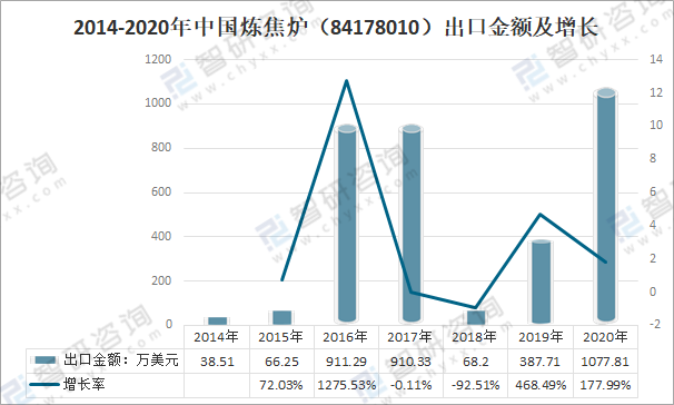 2014-2020年中國煉焦爐(84178010)出口金額及增長