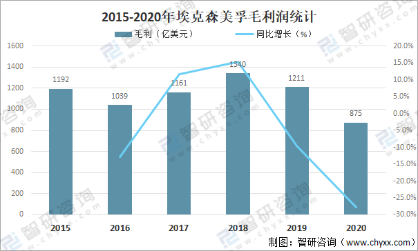 隨著埃克森美孚營業收入的減少,毛利潤也隨之減少,2020年埃克森美孚毛利潤為875億美元,較2019年減少了336億美元,同比減少27.7%。