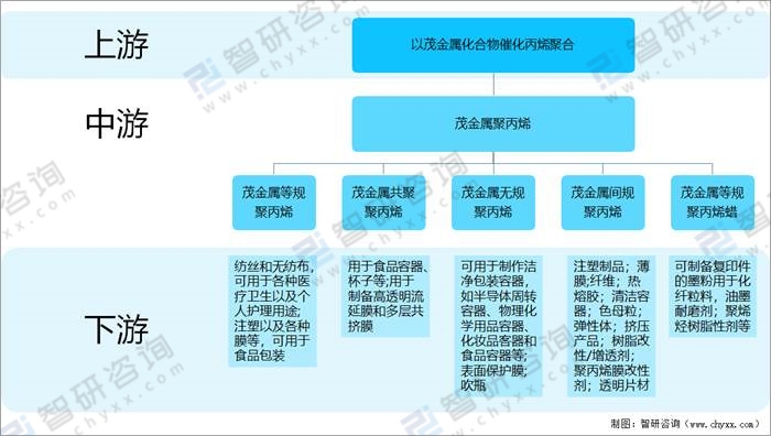 MPP可根據聚合方式分為等規、共聚、無規、間規聚丙烯及等規聚丙烯蠟。產業鏈方面,上游原材料為茂金屬化合物及丙烯,下游主要應用于纖維、注塑制品和薄膜。