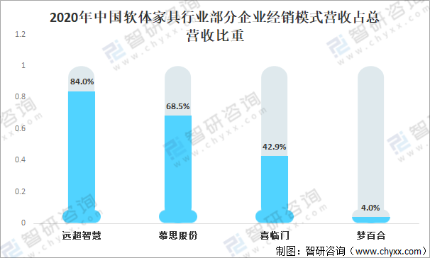 軟體家具行業已經形成了經銷、整裝、直營、電商、工程等多渠道并舉的銷售方式,從2020年中國軟體家具行業部分企業經銷模式營收占總營收比重來看,其中遠超智慧占比84.0%、慕思股份占比68.5%,喜臨門占比42.9%。經銷模式占中國軟體家具銷售模式比重較大。