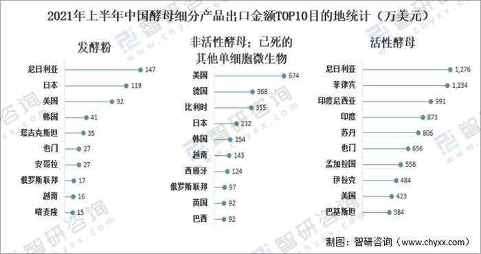 從酵母細(xì)分產(chǎn)品出口目的地來看,2021年上半年中國發(fā)酵粉主要出口至尼日利亞、日本和美國,出口金額分別為146.6萬美元、119.2萬美元、91.6萬美元;非活性酵母;已死的其他單細(xì)胞微生物主要出口至美國、德國和比利時,出口金額分別為673.6萬美元、368.0萬美元、355.0萬美元;活性酵母主要出口至尼日利亞和菲律賓,出口金額分別為1276.0萬美元、1234.4萬美元。