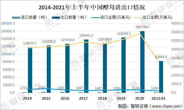 2014-2021年上半年中國酵母進(jìn)出口情況