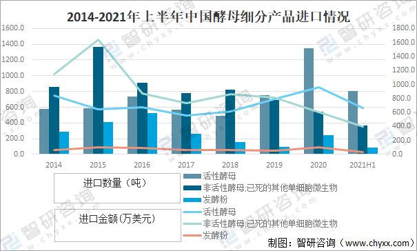 2014-2021年上半年中國酵母細(xì)分產(chǎn)品進(jìn)口情況