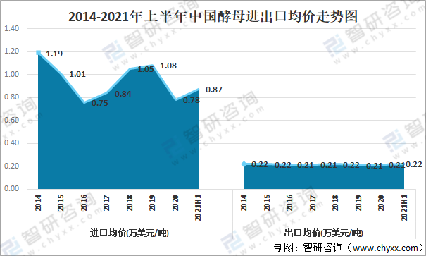從進(jìn)出口均價來看,中國酵母進(jìn)口均價明顯高于出口均價,2021年上半年中國酵母進(jìn)口均價為0.87萬美元/噸,出口均價為0.22萬美元/噸。