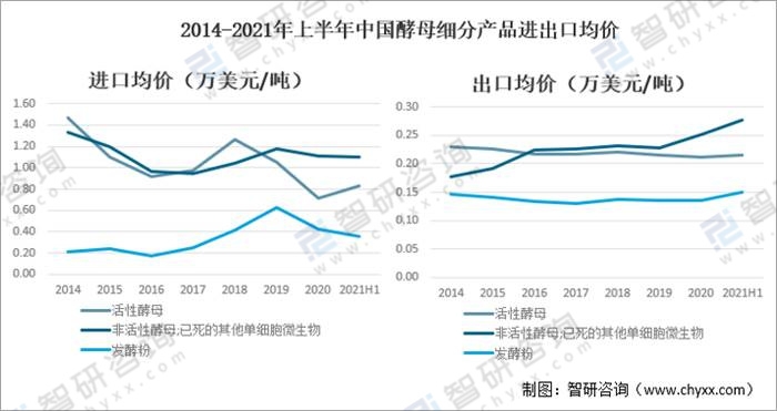 2014-2021年上半年中國酵母細(xì)分產(chǎn)品進(jìn)出口均價