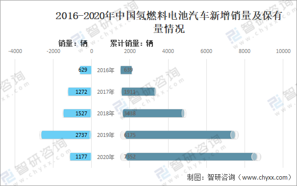 2016-2020年中國氫燃料電池汽車新增銷量及保有量情況